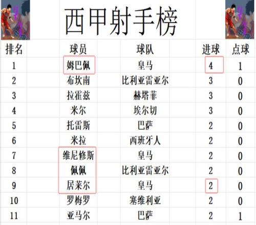射手榜方面,姆巴佩依然狀態(tài)火熱,今天傳射建功后,4輪打入4球,獨(dú)自領(lǐng)跑射手榜。布坎南,米爾和拉霍茲3球并列第2。居萊爾今天打入一球,追上維尼修斯,亞馬爾,羅梅羅等人,2球擠入前十。